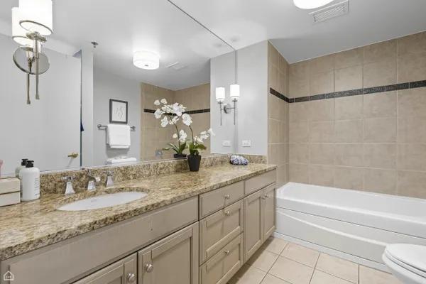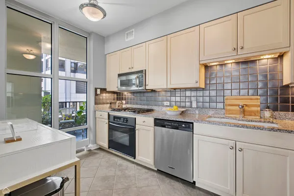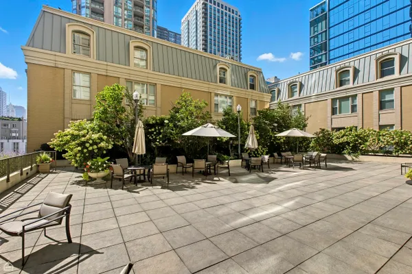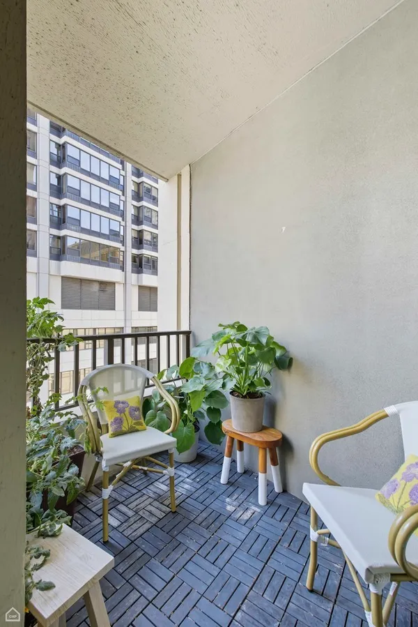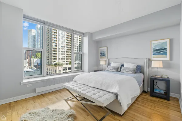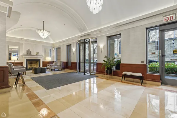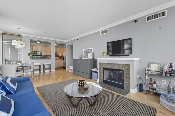 Rarely available corner 1-bedroom, 1.5-bathroom corner condo in the prestigious Fordham building offers a perfect blend of elegance, functionality, and vibrant city living. With floor-to-ceiling windows and northeast city views, the space is drenched in natural light. The open-concept layout features refinished hardwood floors throughout, a gas fireplace, and a flexible living and dining space perfect for entertaining. The kitchen includes granite countertops, stainless steel appliances, and ample cabinet storage. Retreat to the primary suite, featuring a walk-in closet and a spa-like en-suite bath complete with a soaking tub, separate walk-in shower redone with Italian tile, and dual vanity. Have a morning coffee on the private, covered balcony surrounded by lush planters and city views. The Fordham offers resort-style amenities, including an indoor pool, renovated fitness center, sundeck, theater, party room, dog run, and more - all supported by 24-hour door staff and on-site management, just steps from Whole Foods, dining, shopping, and public transit. Storage and garage parking ($35,000) is included. This is urban luxury at its finest - don't miss your chance to call The Fordham home! New workout facility, hot tub, pool, outdoor deck, hospitality room, library, bar.
