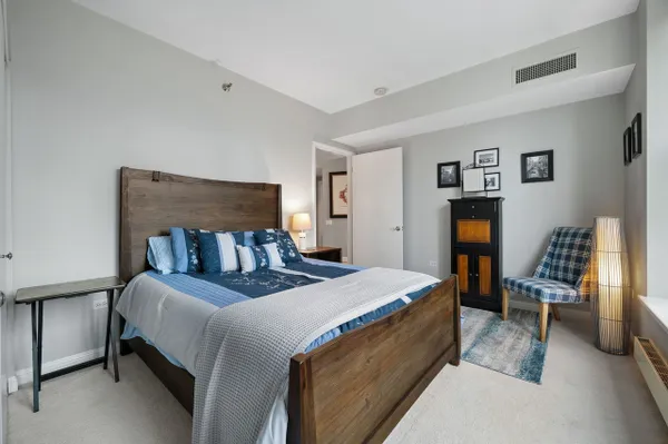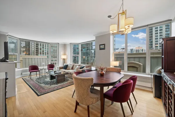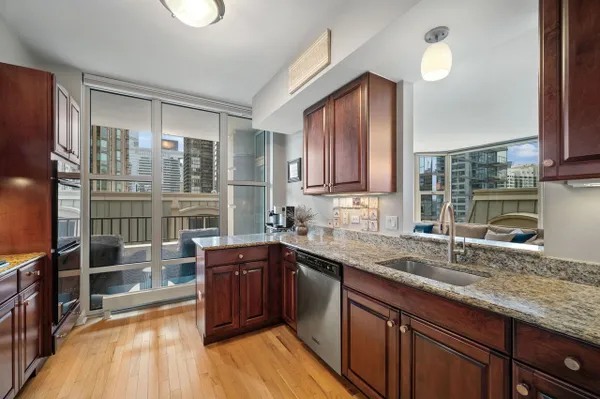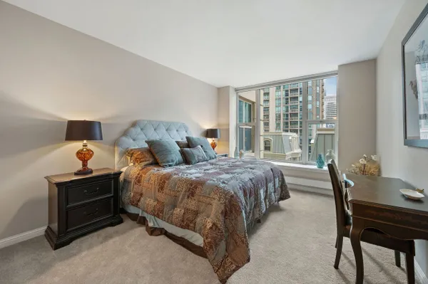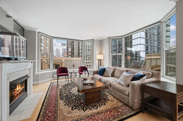 Beautiful two bedroom, two bath home at the Fordham. This home features a split floor plan, high ceilings, oversized windows, hardwood floors, a fireplace and covered balcony. Kitchen includes a breakfast bar, Subzero refrigerator, five burner Thermador cooktop, wine fridge, granite countertops and pantry. Large primary bedroom has a walk-in closet and bath with separate shower, whirlpool tub and double sink vanity. In unit side by side washer dryer and lots of closet space throughout. The Fordham is a full service luxury building that offers 24 hour door staff, on site management/maintenance staff, fitness center, indoor swimming pool with sauna and steam room, sundeck, private movie theater, wine cellar, cigar room and guest parking. Fantastic River North location. One parking space included!